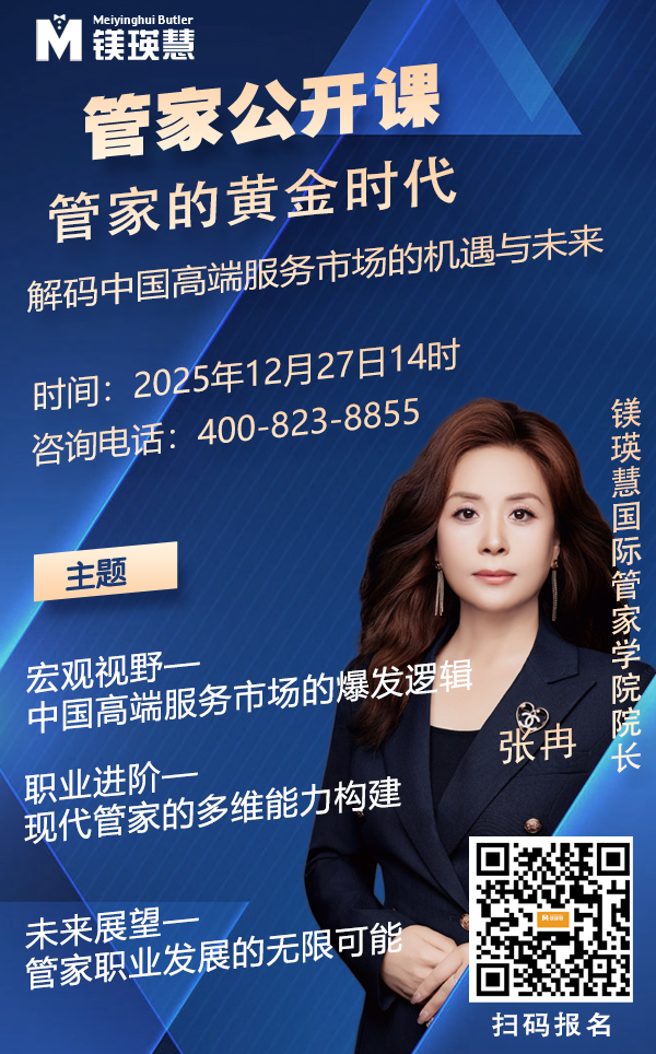 席位有限,洞察無限。 2025年12月27日下午2點,讓我們相聚鎂瑛慧國際管家學(xué)院,共同繪制中國管家行業(yè)的未來藍圖,迎接屬于專業(yè)服務(wù)者的黃金時代。